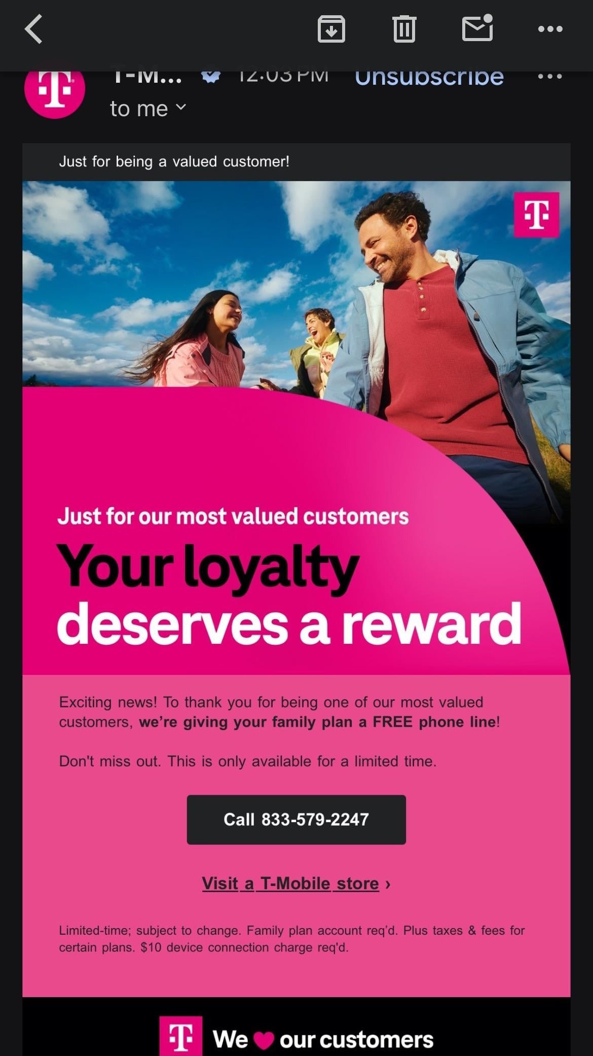 Поверить в рынокМногие пользователи Reddit сообщили о получении электронных писем или текстовых сообщений от T-Mobile, в которых говорится, что они имеют право на бесплатную дополнительную линию на своем счете.
