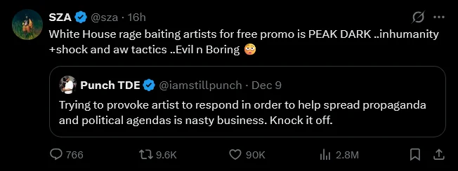 SZA раскритиковала Белый дом за использование её песни в публикации об операциях ICE. Она обвинила администрацию в преднамеренном провоцировании артистов для получения бесплатной рекламы, назвав это формой ‘rage baiting‘.