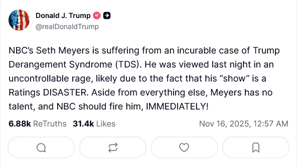 Поверить в рынокКонфликт начался после того, как Seth Meyers высмеял Donald Trump во время недавнего сегмента в своем шоу «Late Night». Trump ответил на своей платформе в социальных сетях, Truth Social, обвинив Meyers в чрезмерной критике и заявив, что рейтинги шоу очень низкие. Он также, как сообщил председатель FCC Brendan Carr, заявил, что у Meyers нет таланта и его следует уволить.
