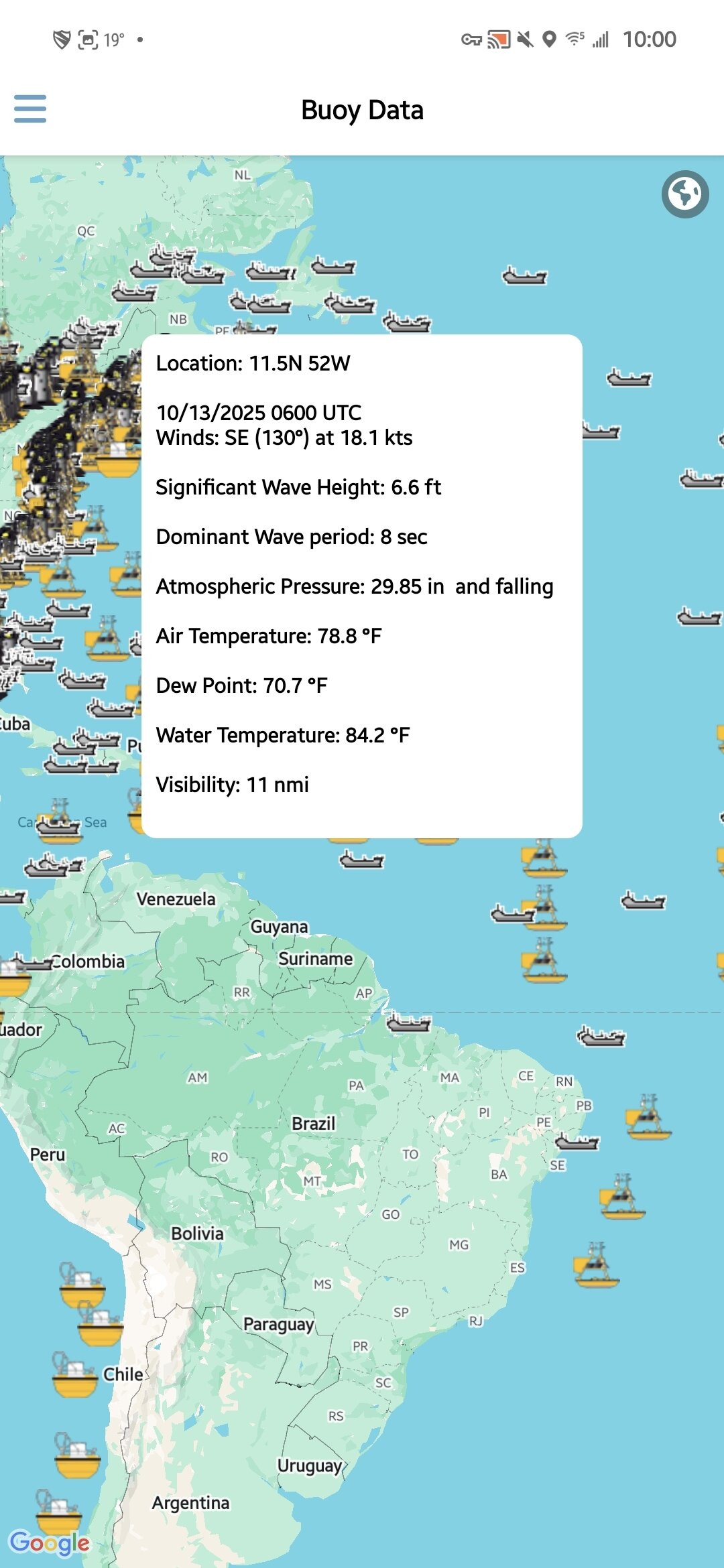 Это приложение предназначено не только для начинающих; оно также предлагает подробную информацию для любителей погоды. Раздел «Buoy Data» показывает показания в реальном времени из различных источников, таких как корабли, метеостанции и буи по всей стране и прилегающим водам. Хотя было бы удобно видеть эти данные непосредственно на главной странице отслеживания штормов, всё же полезно иметь возможность проверять условия на станциях вблизи пути шторма.
