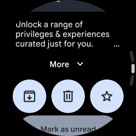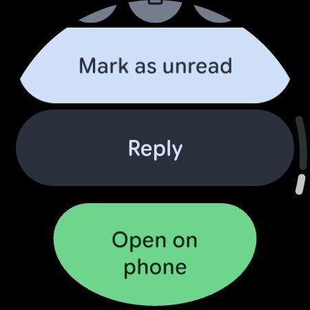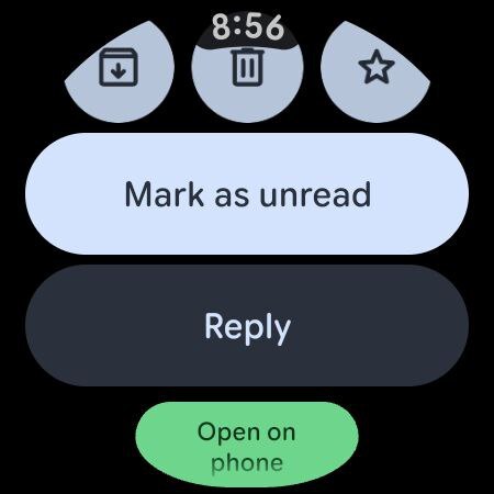 Как исследователь, я заметил обновление визуального дизайна некоторых кнопок в нашей системе. Кнопка ‘Отметить как непрочитанное’ теперь имеет более яркий фон по сравнению с предыдущим тусклым серым цветом, и это улучшение также было применено к кнопкам архивации, удаления и звезды. Хотя кнопка ‘Ответить’ осталась серой, она была немного увеличена по сравнению со своим первоначальным размером. Наконец, кнопка ‘Открыть на телефоне’ претерпела изменения: теперь она окрашена в свежий зеленый цвет и имеет новую дуговую форму, которая прилегает к нижнему краю экрана – отличительная черта дизайна Google Material 3 Expressive для Wear OS.