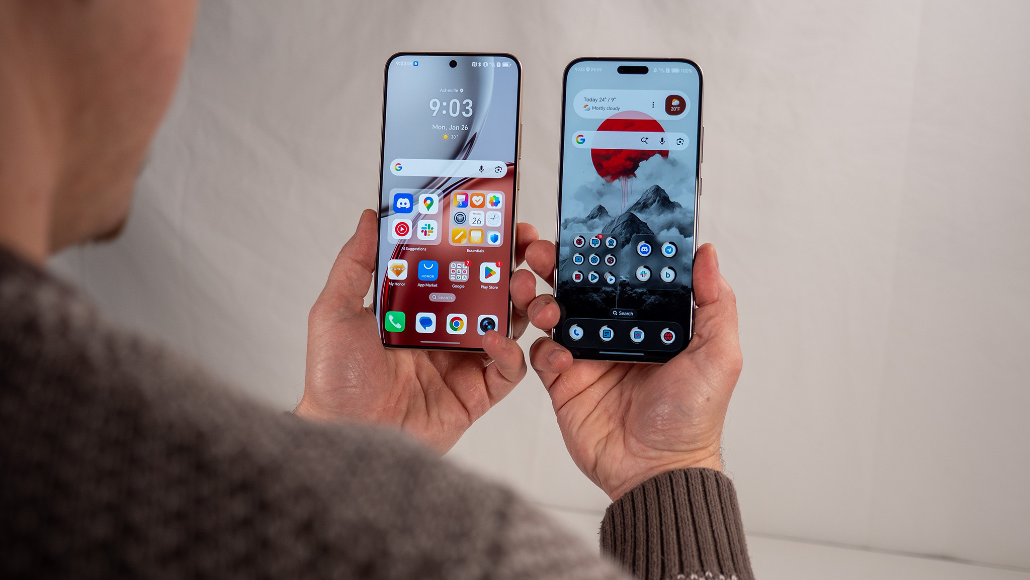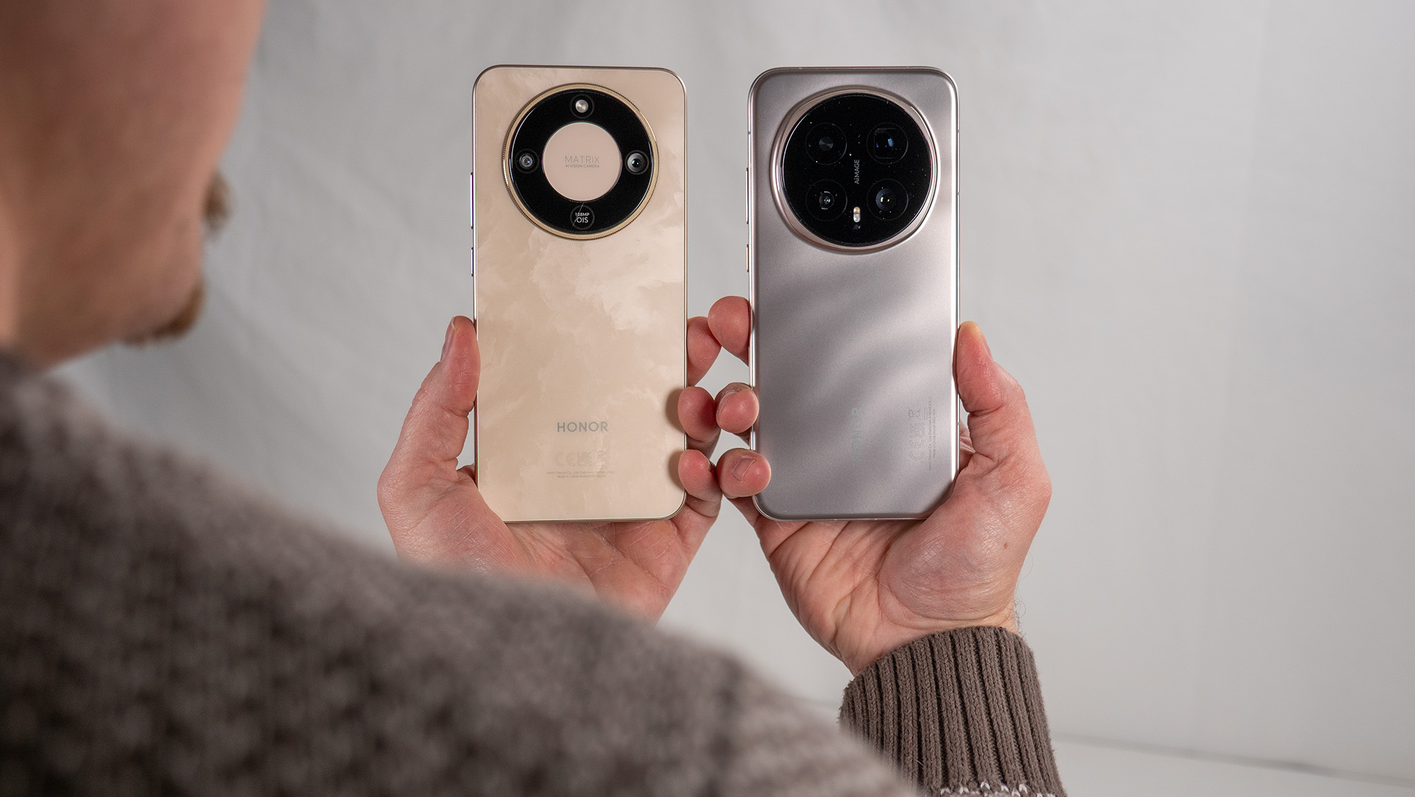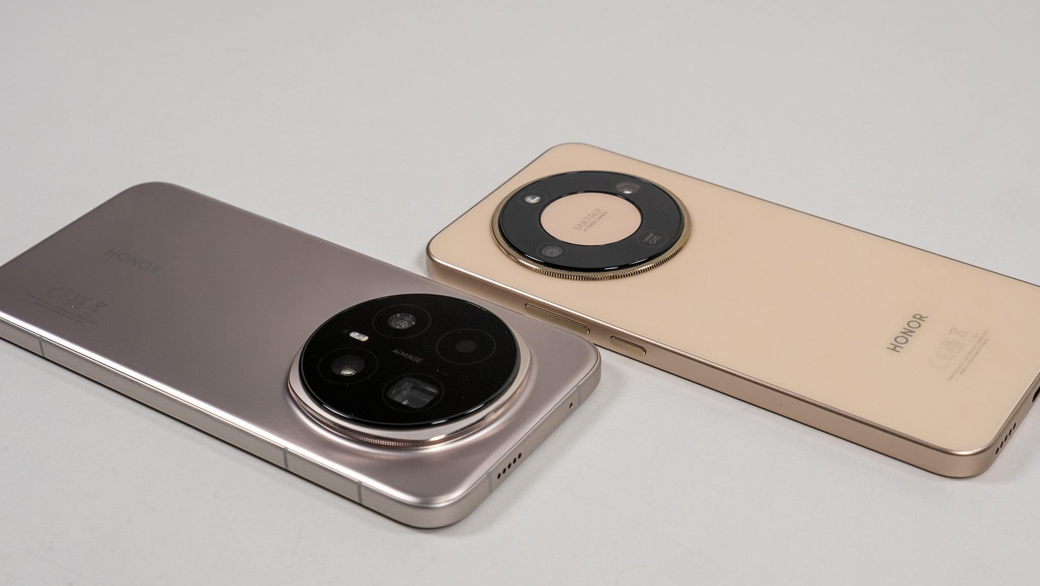 Оба телефона Honor имеют пластиковые задние панели, но в Magic 8 Pro используется специальный волокно-армированный материал, который приятнее держать в руках. В остальном дизайн очень похож.