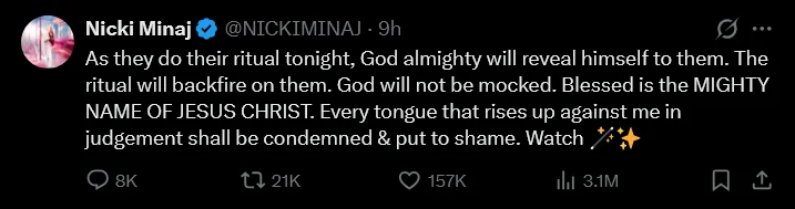 Она завершила свои онлайн-публикации религиозным высказыванием, процитировав: ‘Бога не посмеешь дразнить. Благословенно МОГУЩЕЕ ИМЯ ИИСУСА ХРИСТА.’ Эти публикации были общедоступны в её аккаунте X, пока люди отвечали на них.