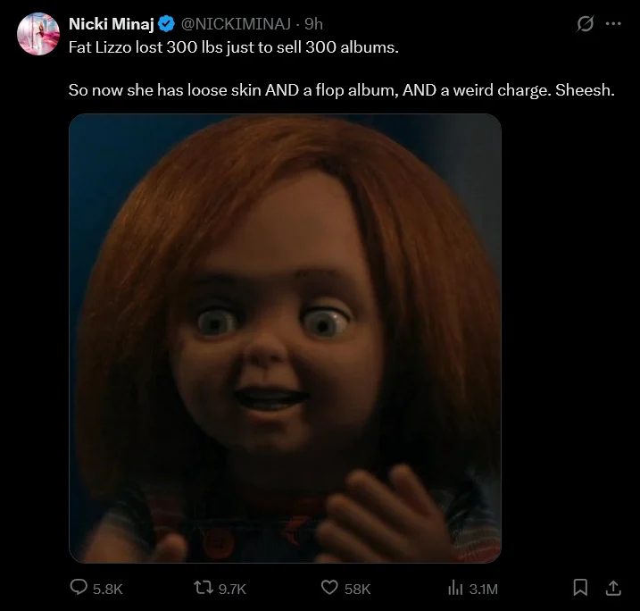 Минаж продолжила критику Лиззо публикацией, которая содержала обидные комментарии о её теле и карьере. Она оскорбила вес Лиззо, успех её альбомов и некоторые её юридические проблемы. Публикация быстро распространилась в сети и была освещена многими новостными источниками после реакции общественности.