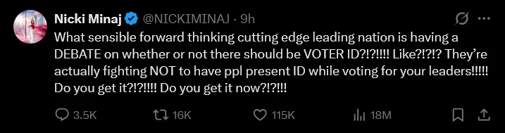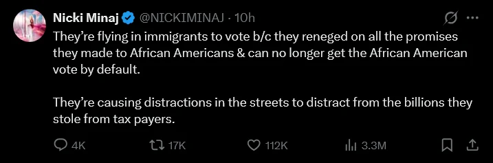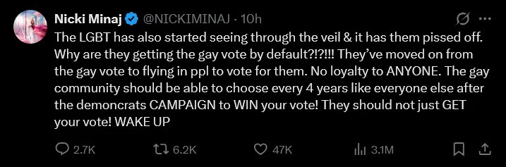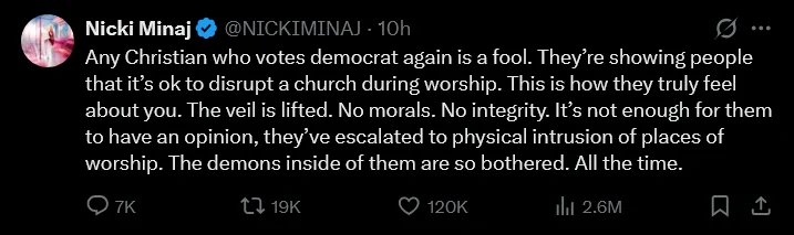 Затем разговор перешёл к политике и религии. Nicki Minaj высказала критику в адрес демократов, политики в отношении иммиграции и правила голосования. Она также поделилась своими взглядами на христианство и ЛГБТК+ сообщество, предположив, что политики используют эти темы для манипулирования людьми. Она прямо заявила, что христиане, голосующие за демократов, поступают неразумно, а также выразила обеспокоенность по поводу честности выборов и необходимости законов об удостоверении личности избирателей.