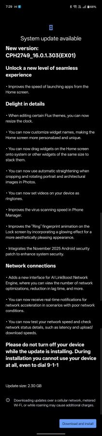 Первоначальное обновление программного обеспечения, версия CPH2749_16.0.1.303(EX01), включает в себя множество улучшений. Оно улучшает производительность, темы, сетевые инструменты и даже анимацию отпечатка пальца. Обновление весит 2.3ГБ, что является существенным объёмом для первого релиза.