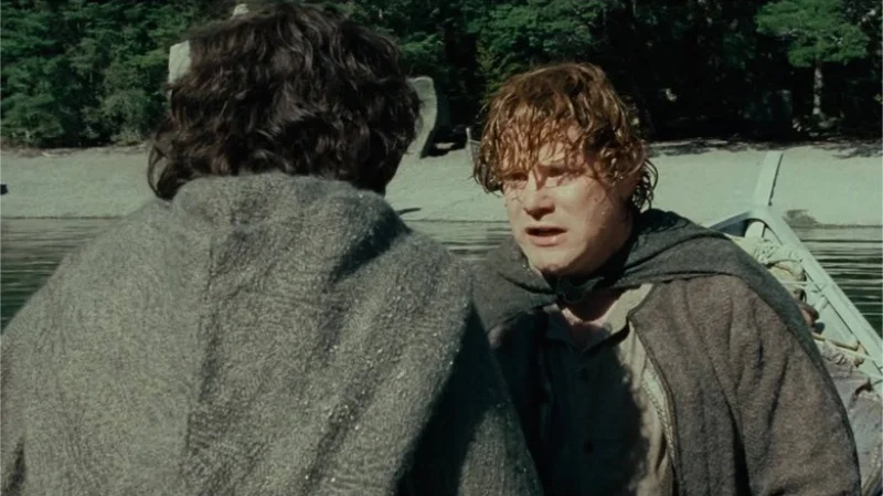 По мере того, как фильм подходит к концу, Фродо садится на лодку, а Сэм следует за ним, бродя по воде. Когда смотришь на сцены, где Сэм борется под водой, а затем выныривает за воздухом, то видишь, что положение его лямок и снаряжения на плечах непоследовательно. Лямка может быть расположена высоко в одном кадре, а затем ниже или перекручена в самом следующем, несмотря на то, что в сюжете прошло лишь немного времени.