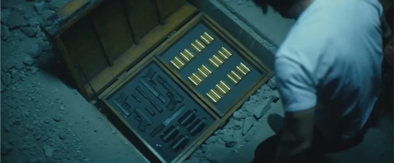 Потраченные стреляные гильзы создают заметные узоры на полу во время съемок, особенно когда сцены переключаются между локациями или действиями. После каждого склейки в сцене гильзы, кажется, перемещаются или становятся более редкими, хотя их никто не убирает. Если вы вернетесь в то же место на полу, вы обнаружите другое разбросанное количество гильз, чем раньше, что отражает изменившийся угол камеры. Узор по сути перезапускается с каждым новым кадром, и монтаж подчеркивает эти изменения в распределении гильз.