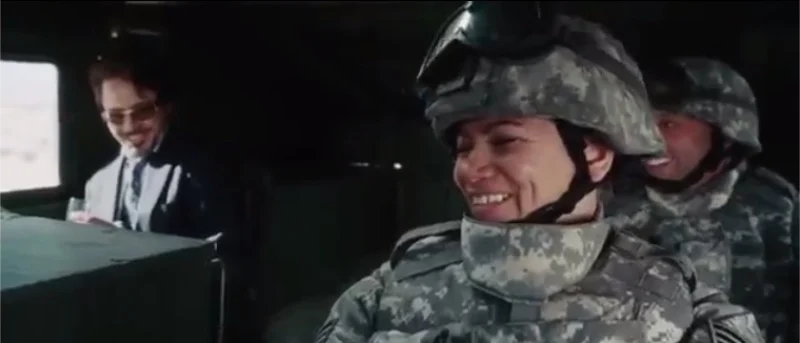Окей, так сразу в начале есть сцена с Тони в Humvee с солдатами, и он позирует для фотографий. Я заметил действительно странный монтаж, однако. Он поднимает свои солнцезащитные очки в одном кадре, а затем через долю секунды – буквально в следующем ракурсе – они расположены по-другому, или даже полностью исчезают, только чтобы снова появиться. Странно, потому что разговор течет естественно, но солнцезащитные очки, кажется, не остаются согласованными от кадра к кадру. Это мелочь, но это определенно вырвало меня из момента.