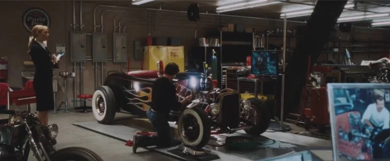 Гараж Тони полон крутых машин, и рядом можно увидеть верстак. Во время съемок ранних тестов репульсора одна из машин на заднем плане постоянно слегка перемещалась. Ее положение и угол менялись между кадрами, поэтому она не всегда одинаково сочеталась со столом и инструментами. Иногда колесо было направлено наружу, а в следующем кадре машина оказывалась более прямой или немного дальше от верстака.