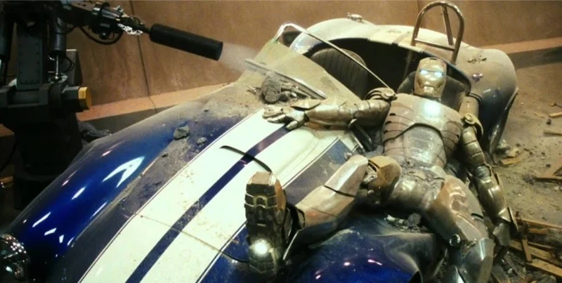 После того, как тест Тони идёт не по плану, робот опрыскивает его пеной, покрывая костюм и пол. Однако количество пены заметно уменьшается между кадрами, а затем внезапно появляется снова, когда меняется угол обзора камеры. Эта перемена происходит слишком быстро, чтобы пена могла рассеяться сама по себе.