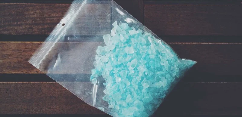 Высокочистый метамфетамин обычно бесцветный или белый и образует прозрачные или белые кристаллы. Если он выглядит синим, это обычно означает, что он содержит примеси или добавленные красители – это не указывает на более очищенный продукт. Хотя популярный телесериал связывает синий цвет с конкретным производственным процессом, этот процесс на самом деле не создает стабильный синий цвет в конечном, чистом кристалле.