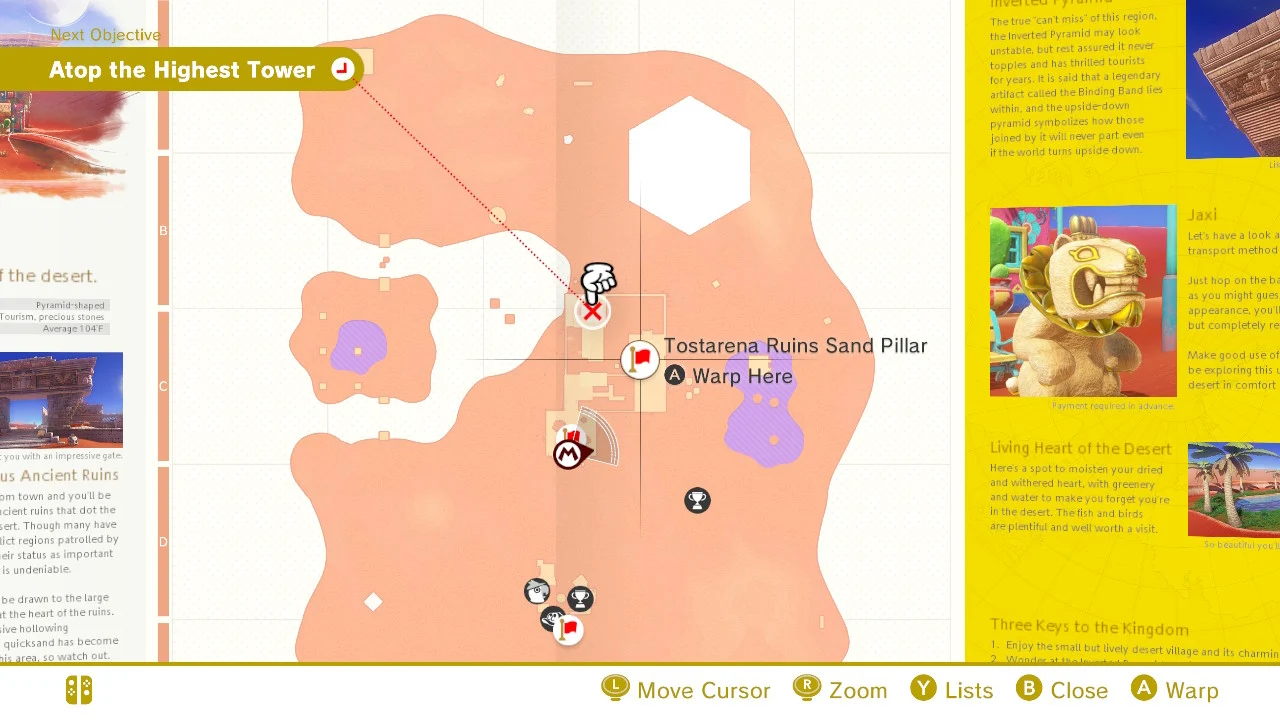 После победы над боссом королевства и завершения основной сюжетной линии вы откроете для себя больше персонажей, испытаний и Лунных Камней. Новый контент появляется повсюду – вы можете попробовать новые гонки на контрольных точках, получить доступ к ранее заблокированным областям и найти новые локации, вырастающие из семян. Список локаций на карте показывает, сколько коллекционных предметов вы нашли по сравнению с общим количеством, которое обновляется по мере вашего прогресса. Как только вы разблокируете новые способности и захватите больше существ, вернитесь в каждое королевство, чтобы эффективно найти все, что вы пропустили.