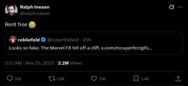 Создатель Дэдпула Роб Лифельд вновь раскритиковал Marvel Studios, на этот раз сосредоточившись на визуальных эффектах для Галактуса в новом фильме «Фантастическая четвёрка». Он опубликовал ролик с Галактусом, разрушающим город, на X (ранее Twitter) и прямо заявил, что эффекты выглядят «такими ненастоящими» и что качество визуальных эффектов Marvel значительно снизилось.