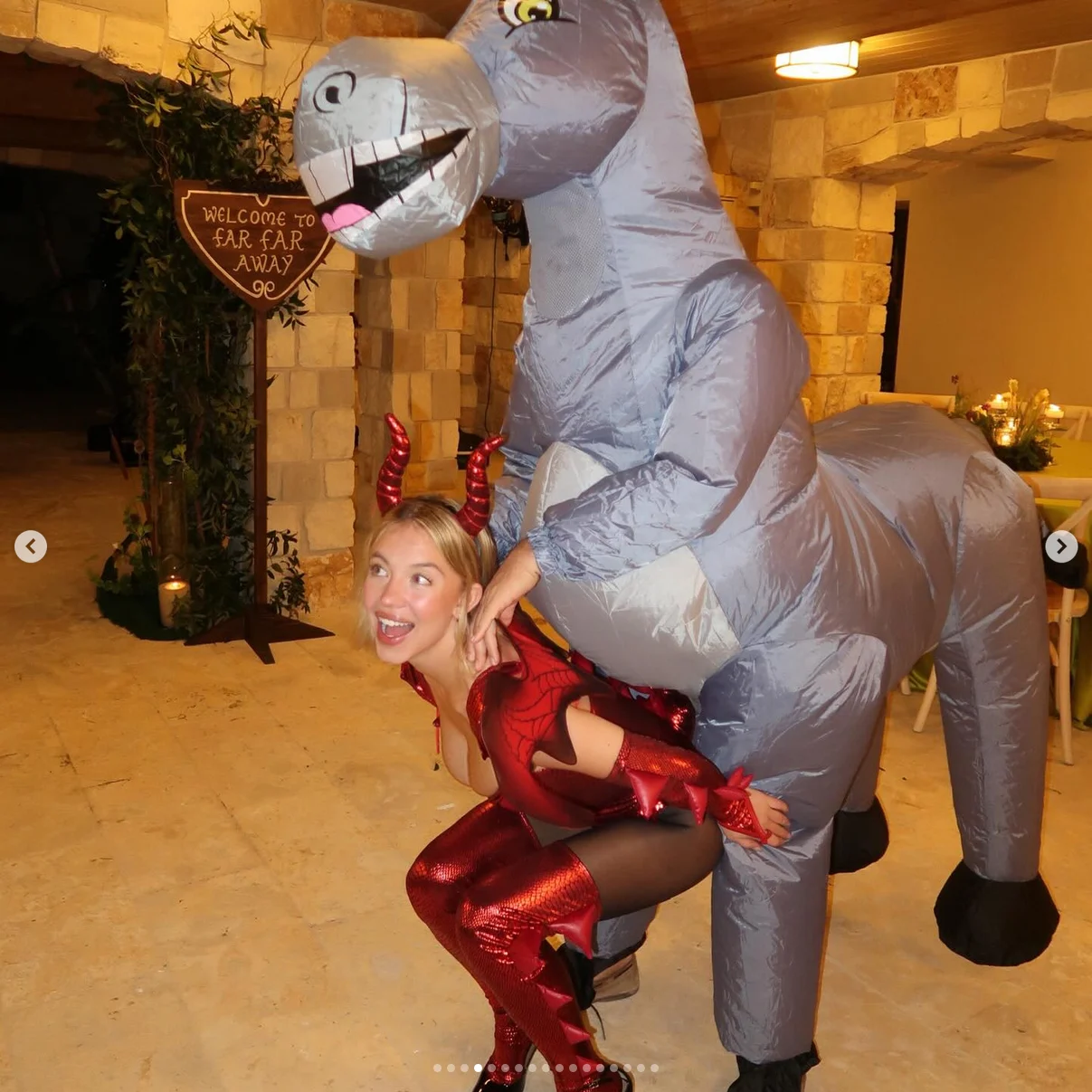 Сидни Свини опубликовала фотографии в Instagram, на которых она предстала в эффектном красном металлическом наряде. Образ включал в себя откровенный боди, подходящие носки и накладки на руки, а также забавные уши Dragon Ball. Она завершила ансамбль черными чулками и каблуками. На одной из фотографий она игриво несет кого-то, одетого в надувной костюм Осла.