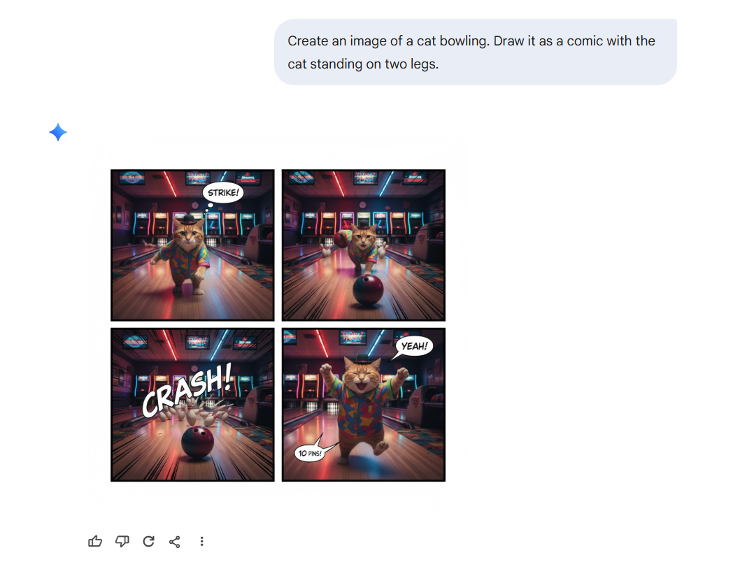 Я попросил ИИ сгенерировать изображение кота, играющего в боулинг, нарисованное как комикс, где кот ходит на двух ногах. Он справился! Полезный совет: детальное описание ваших запросов может сэкономить вам время и дать лучшие результаты.