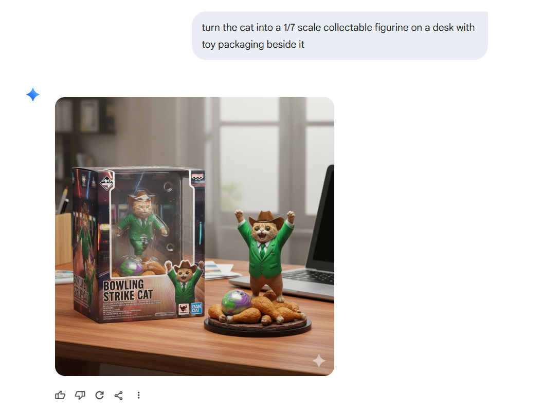 Наконец, я попросил Gemini создать изображение моей кошки в виде небольшой коллекционной фигурки – той, которую можно увидеть на упаковке игрушек, сидящей на столе. Вы, вероятно, видели похожие изображения в интернете, созданные по тому же запросу. Я думаю, результат фантастический, и я его обожаю!