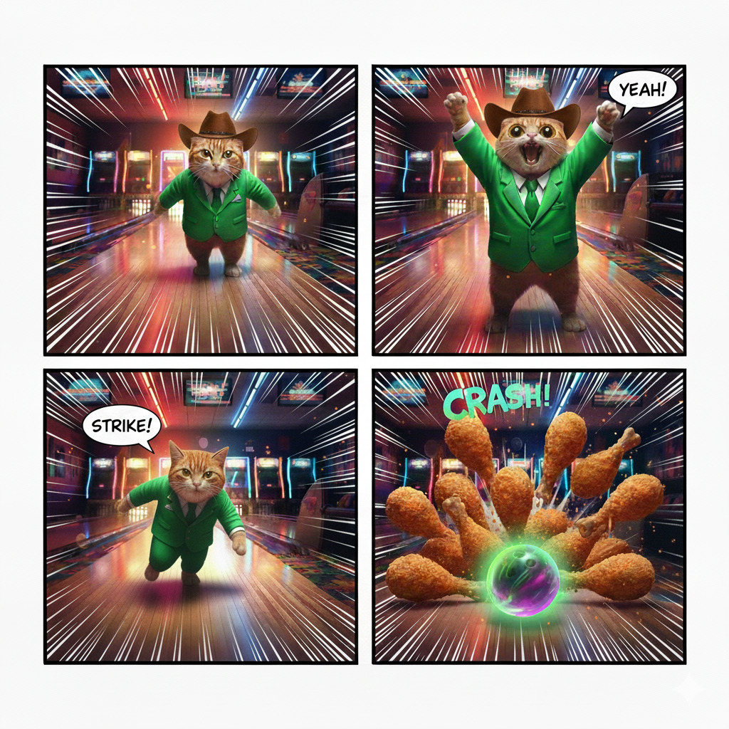 Большинство генераторов изображений могут справляться с простыми запросами, такими как добавление забавных деталей к фотографиям. Что делает Nano Banana особенным, так это то, насколько хорошо он сохраняет согласованность основного изображения. Я протестировал его, запросив множество изменений – ковбойскую шляпу и смокинг для кошки, светящийся шар для боулинга и даже кегли в форме жареной курицы! Nano Banana с радостью внес все эти изменения, но кошка все еще выглядела точно так же, как и в начале, просто немного более мультяшной и яркой, как я и просил.