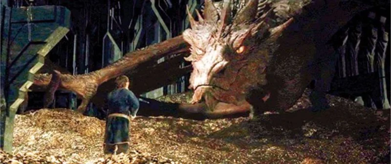 Бильбо обнаруживает скрытый вход в сокровищницу под Одинокой Горой, который открывается благодаря специальной надписи и свету заходящего солнца. Он осторожно разговаривает со Смаугом, хитро избегая раскрытия своего имени или места, откуда он родом, используя описательные титулы и загадки. Во время разговора с драконом Бильбо замечает уязвимое, незащищенное место на животе Смауга.