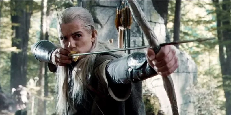 Леголас в основном стрелок из лука. В фильме ‘The Fellowship of the Ring’ он получает лук от Лотлориэна после того, как группа входит в Золотой Лес. Фильм подчеркивает его мастерство быстрых и точных выстрелов по движущимся врагам, таким как пещерные тролли и орки, даже когда они атакуют вблизи. Он сохраняет эту скорость и точность в ‘The Two Towers’ и ‘The Return of the King’, стреляя стрелами, бегая по сложной местности и вдоль переполненных стен во время сражений.