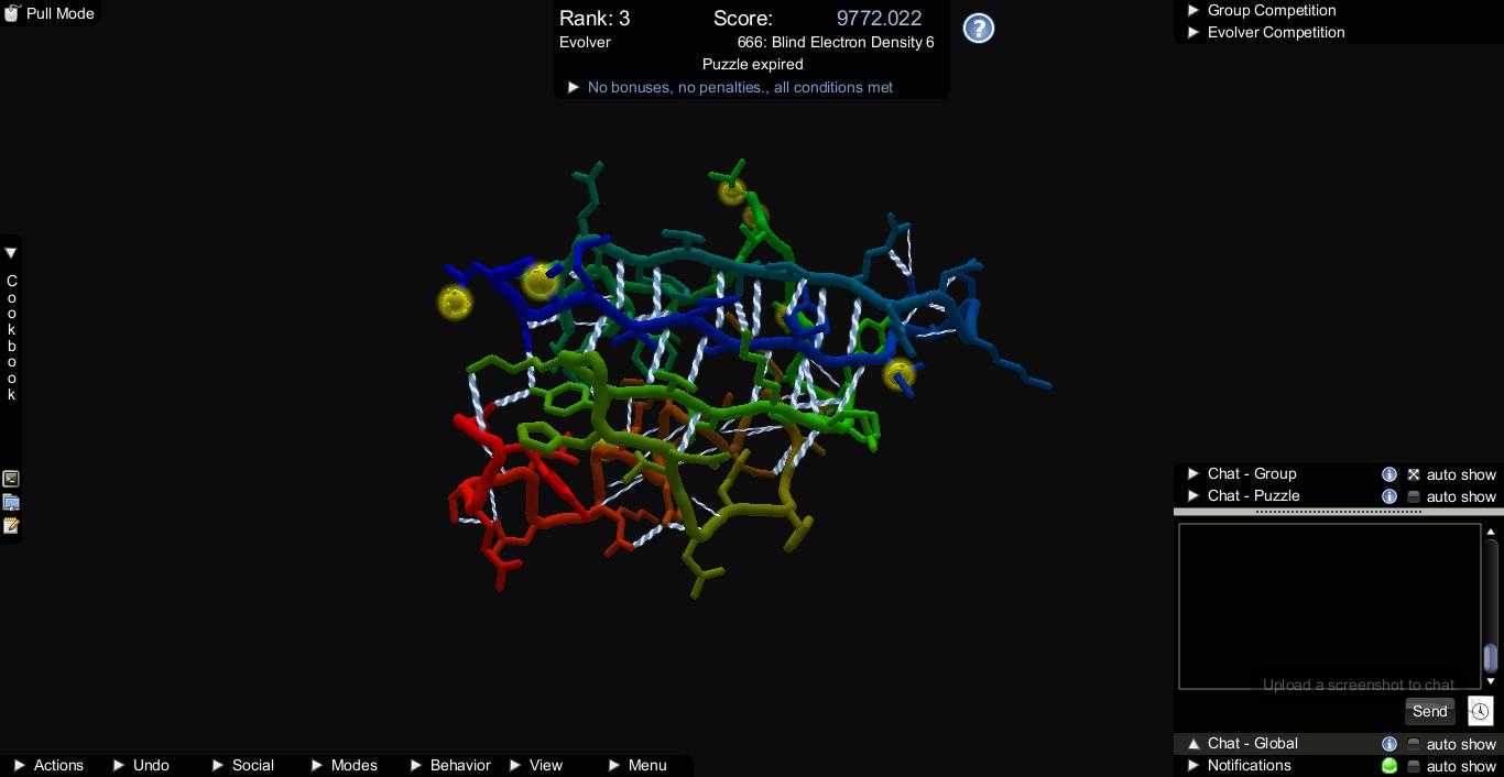Foldit – это головоломка, в которой вы решаете реальные биохимические задачи, предсказывая, как сворачиваются белки. Вы скручиваете и поворачиваете цепи, чтобы сделать их максимально стабильными – по сути, создавая прочные связи и избегая столкновений, как это делают ученые при изучении структуры белков.