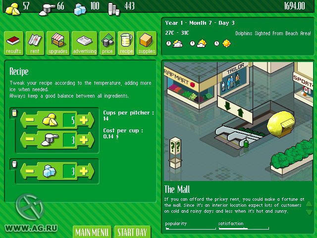 Вы начинаете с небольшой точки продажи напитков и развиваете её в популярный бизнес по всему городу, совершенствуя свои рецепты, цены и объём закупок. Поскольку погода влияет на объём покупок, важно прогнозировать спрос, чтобы убедиться, что у вас достаточно стаканчиков, льда и лимонов. Время ожидания клиентов и место расположения вашей точки также влияют на то, сколько денег вы зарабатываете каждый день и насколько популярным становится ваш бизнес.