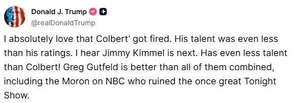 Дональд Трамп часто критиковал ведущих вечерних телешоу. После отмены шоу Стивена Колберта в июле, Трамп опубликовал пост, в котором выразил радость по поводу ухода Колберта, назвав его талант и рейтинги плохими. Он также предсказал, что следующим будет Джимми Киммел, утверждая, что у Киммела еще меньше таланта, чем у Колберта. Трамп похвалил Грега Гаффельда, сказав, что он лучше всех их, и раскритиковал нынешнего ведущего Tonight Show на NBC, назвав его «Идиотом» и обвинив в том, что он испортил шоу.