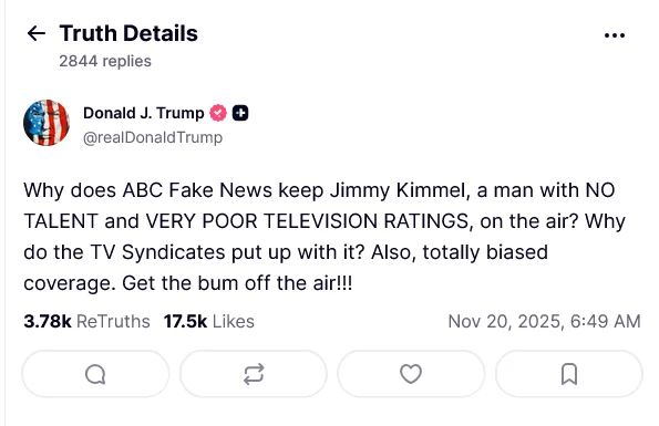 Окей, так что Трамп снова пошел против Джимми Киммела опять! Я видел, что он опубликовал в Truth Social, в основном говоря, что Киммел несмешной, и у его шоу плохие рейтинги, и он требует от ABC его отменить. Это просто… еще одна вещь, понимаете? Он, кажется, действительно не любит Киммела.