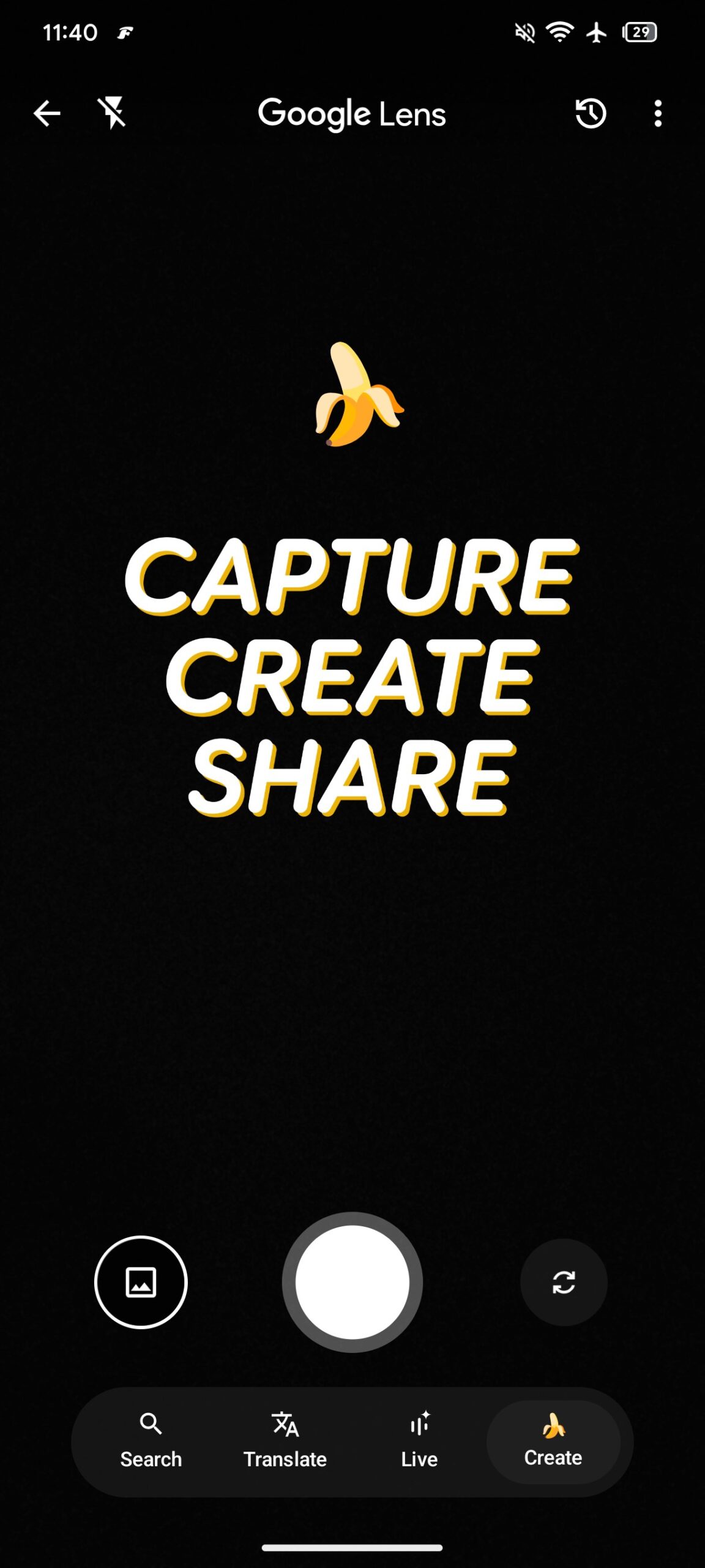 При выборе функции Nano Banana, Lens приветствует вас забавной анимацией, побуждая делать фотографии, создавать креативный контент и делиться им с другими.