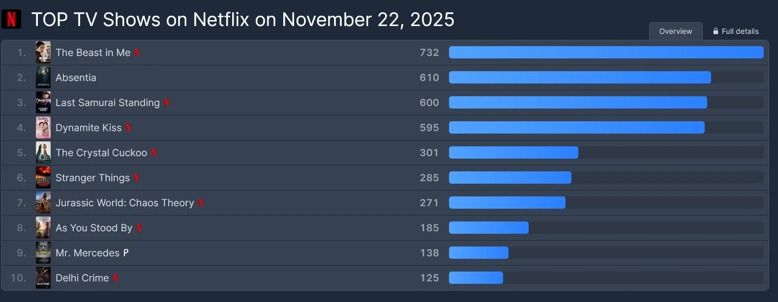 Поверить в рынокСогласно данным FlixPatrol, сериал Absentia, который впервые появился на Amazon Prime Video и AXN, неожиданно вошел в тройку самых просматриваемых телешоу в мире на Netflix, несмотря на то, что его показ завершился несколько лет назад.
