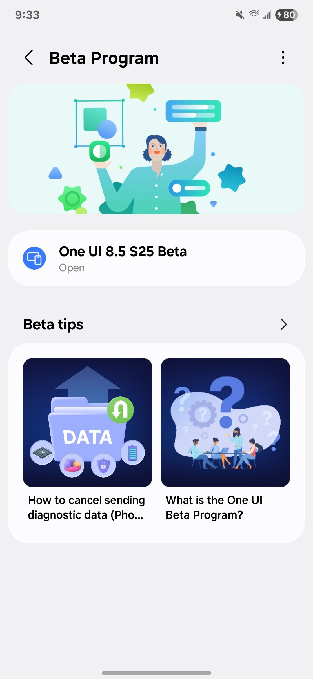 - Нажмите на баннер бета-программы One UI (либо в верхней части приложения, либо внизу; он появляется в обоих местах).