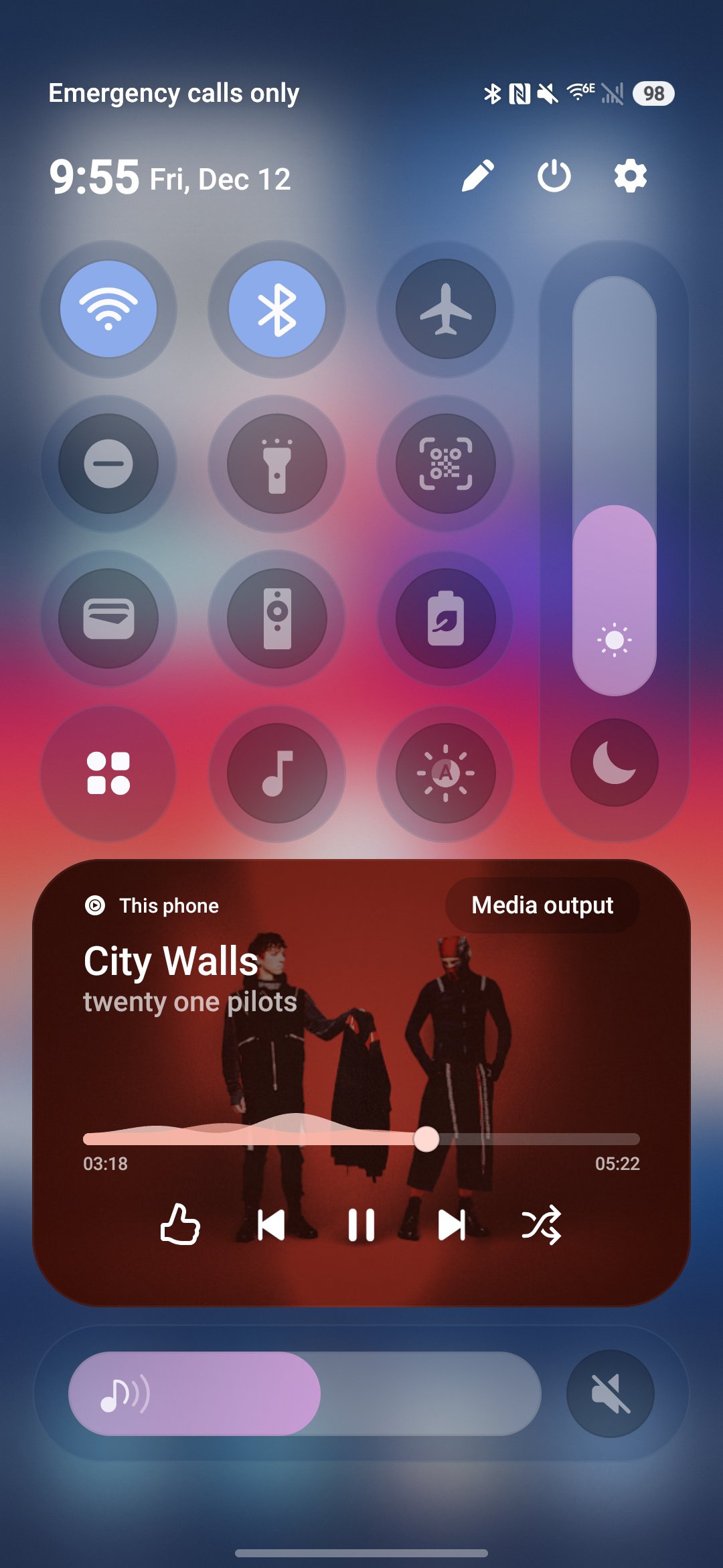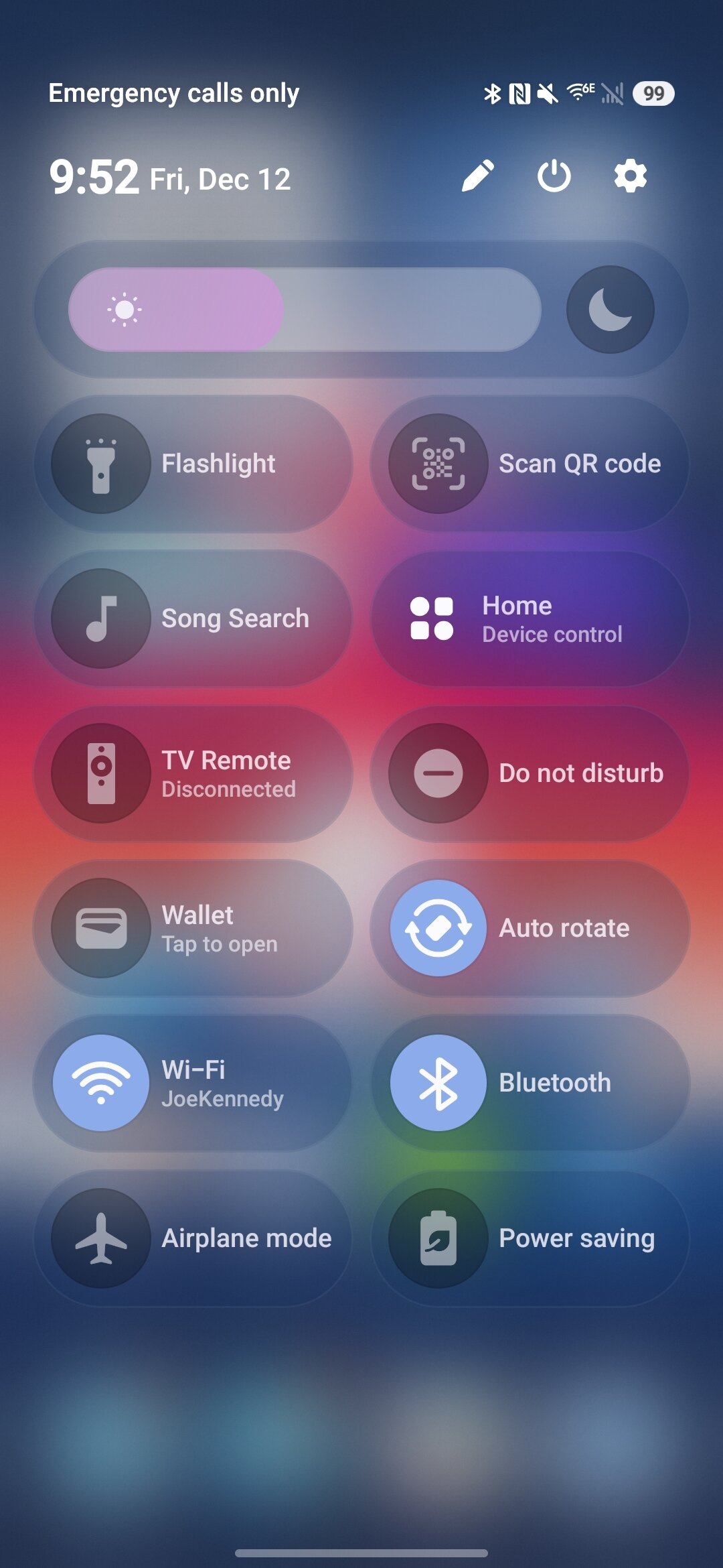 Мои элементы управления мультимедиа находятся вверху, а прямо под ними – четыре большие кнопки для вещей, которые я часто использую – например, фонарик, сканер QR-кодов, определитель песен и мои устройства умного дома. Под ними у меня более мелкие кнопки для пульта Google TV, Google Wallet, режима «Не беспокоить» и поворота экрана. Управление яркостью и громкостью находится в самом низу.