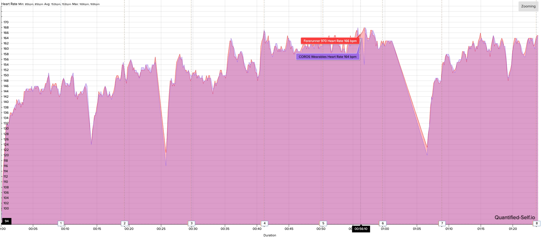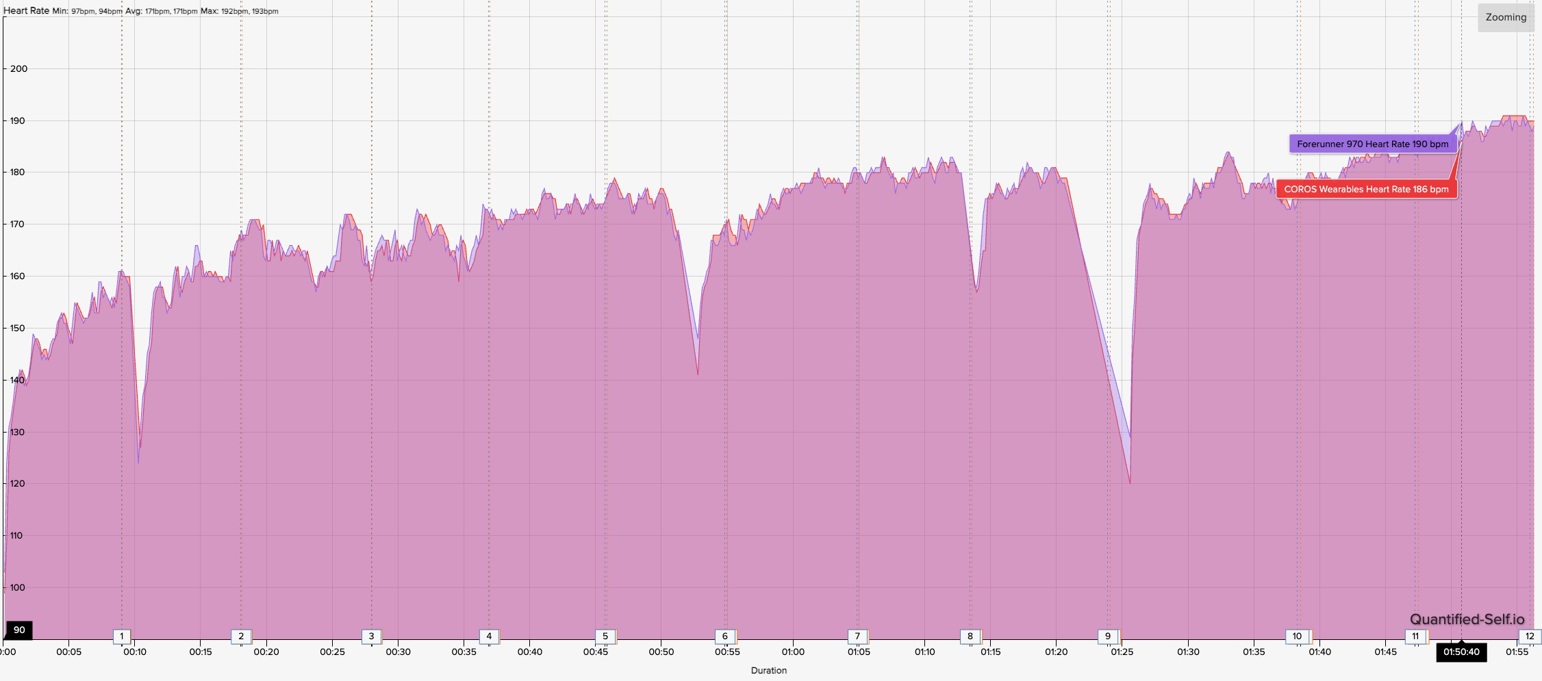Чтобы протестировать COROS PACE 4, я носил его во время пробежек на 19 и 13 километров вместе с Garmin Forerunner 970 и нагрудным датчиком сердечного ритма Garmin HRM 200. Такая настройка позволила мне сравнить данные GPS и частоты сердечных сокращений PACE 4 с данными устройств Garmin.