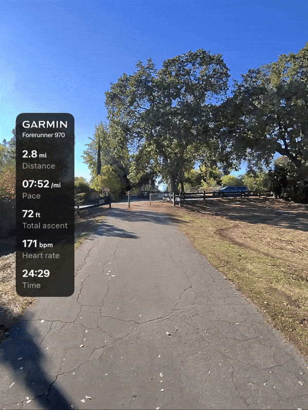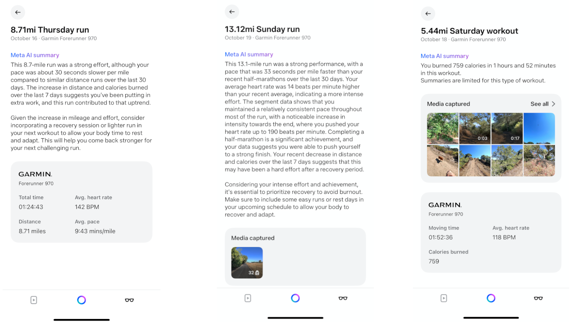 Эта интеграция отправляет данные о тренировке, такие как ваш темп, скорость и частота сердечных сокращений, на очки в режиме реального времени через приложение Meta AI, позволяя вам заниматься спортом, не нуждаясь в том, чтобы держать телефон или часы.