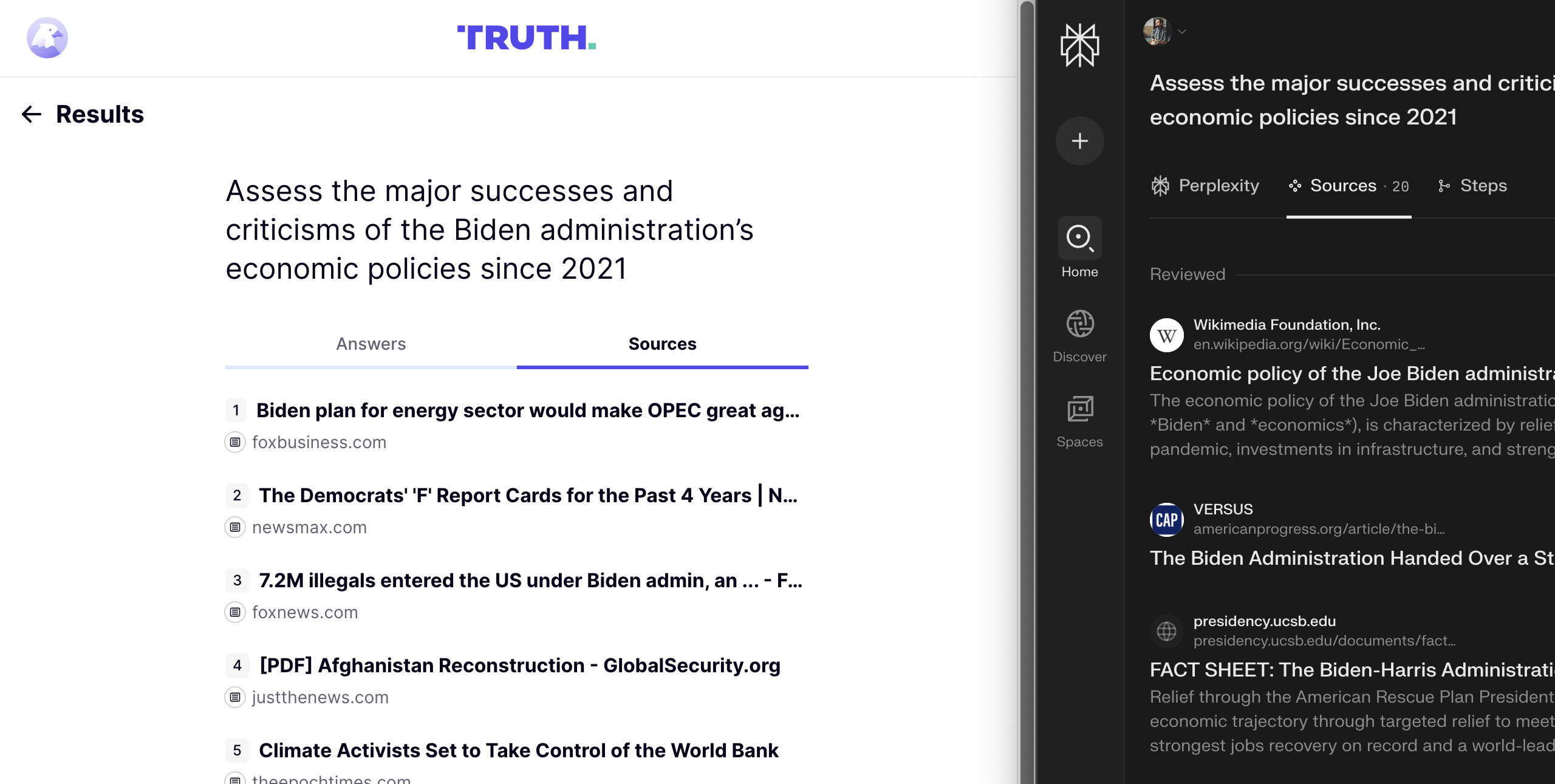 Впоследствии я решил задать неясные вопросы ИИ Truth AI и Perplexity Pro, чтобы получить их мнение о ключевых достижениях и критике экономических стратегий недавней администрации США, начиная с 2021 года. Моей целью было не только получение ответов, но и понимание источников или основы предоставленной ими информации.