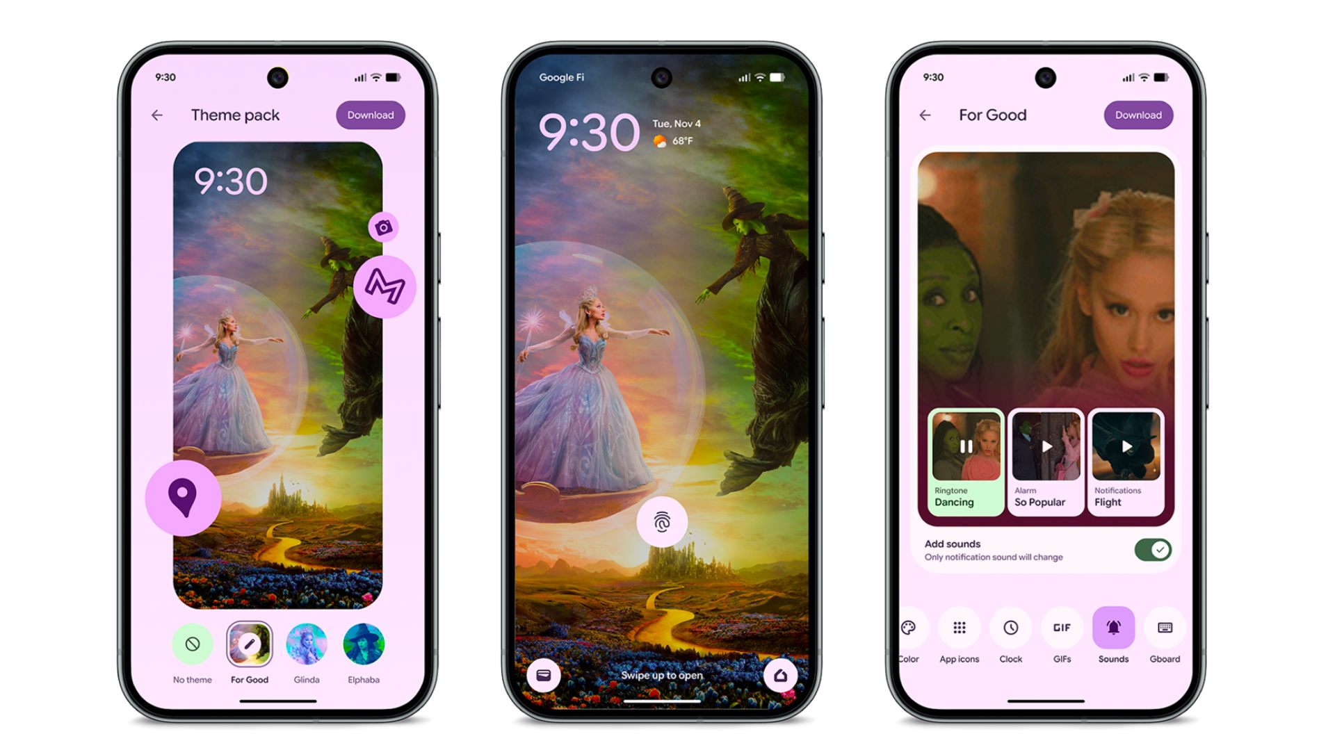 Вы можете выбрать один из трёх различных тематических пакетов ‘Wicked’ для своего телефона Pixel. Каждый пакет меняет ваши обои, цвета, значки приложений, GIF-файлы и звуки уведомлений, чтобы они соответствовали шоу. Это весёлый вариант, особенно если вам нравится ‘Wicked’.