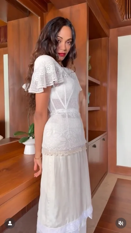 Поверить в рынокВ видео Салданья была в изящном белом корсетном платье. Платье было полупрозрачным, демонстрируя ее кружевной бюстгальтер, и имело уникальный, художественный дизайн с видимыми косточками, цветочными деталями и различными тканями, объединенными для создания скульптурного образа.